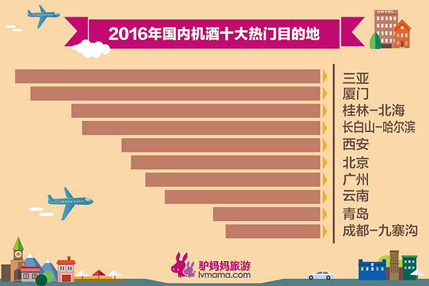 不难发现,上述一些目的地的“出镜率”相当高。驴妈妈旅游网数据显示,2016年国内机酒十大热门目的地分别是三亚、厦门、桂林-北海、长白山-哈尔滨、西安、北京、广州、云南、青岛、成都-九寨沟。三亚和厦门等滨海度假胜地一年四季长旺,8月订单量呈爆发式增长;北方的长白山-哈尔滨一地,1-2月的冬季正是一年中风景最美时,游人如织,8月也迎来订单高峰期,此时游客更多前来消夏避暑;地处西北的历史古都西安,3-10月皆处于旺季。
