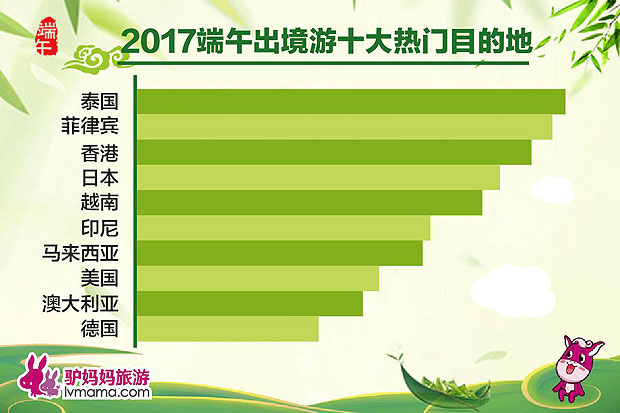 今年端午,人们出境游玩最爱去哪里?《报告》显示,泰国、菲律宾、香港、日本、越南、印尼、马来西亚、美国、澳大利亚、德国成为出境游十大热门目的地。其中,“一带一路”沿线旅游热门地东南亚国家仍然人气爆棚,端午出游人次上涨2倍。