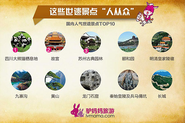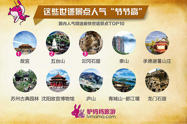 驴妈妈旅游网数据显示,故宫、五台山、云冈石窟、泰山、承德避暑山庄、苏州古典园林、沈阳故宫博物馆、庐山、青城山-都江堰、龙门石窟成为2016年参观人数增速最快的十大世界遗产景区。