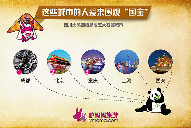 驴妈妈旅游网数据显示,涵盖四川大熊猫栖息地在内的熊猫主题游产品的预订一直以来都十分火爆,成都、北京、重庆、上海、西安成为五大主要客源地。与此同时,“国宝”也带火了四川境内的世遗游。驴妈妈“开心驴行”产品“九寨沟-黄龙-峨眉-乐山-熊猫乐园双飞8日深度游”、“九寨沟-黄龙-熊猫乐园双飞6日跟团游”、驴悦亲子“成都-熊猫基地、宽窄巷子双飞4日游”等线路受到全年龄层用户的青睐,好评率均达到92%以上。