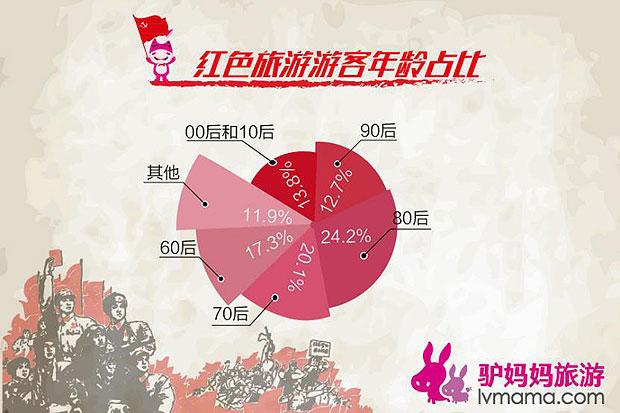 在游客的年龄分布上,《报告》显示,今年1-6月,驴妈妈旅游网平台红色旅游游客的平均年龄为35岁,其中00后和10后占比13.8%,90后占比12.7%,80后占比24.2%,70后占比20.1%,60后占比17.3%。由数据可看出,红色旅游的游客结构相比过去已发生很大改变,红色旅游不再是中老年人的“专利”,以80后为代表的年轻人正在成为红色旅游的中坚力量。