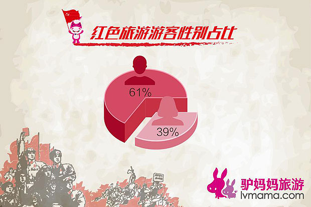 《报告》同时指出,在红色旅游的游客中,男性占比61%,而女性占比39%,男性出游人数高出女性22个百分点,这主要是因为男性对于革命历史、战争等方面的兴趣大于女性。