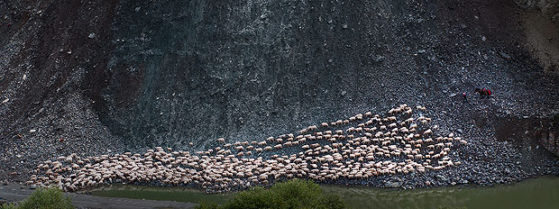 转场,是牧民随着季节的变化而转移草场放牧的迁徙游牧方式。牧民们每年在特定时间都会赶着羊群奔波几十甚至上百公里,寻找水草丰沛的牧场。转场是牧民们自古以来逐水草而居的传统。如今,随着生态环境的日趋严峻,牧羊人也会根据现有牧场情况进行转场。山坡陡峭,牧道曲折,远处观望,颇有悲壮之味。