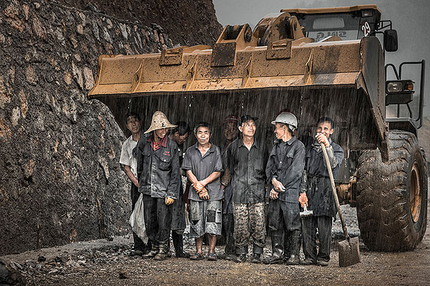 在去往贵州丹寨石桥的路上,天空突然下起大雨,一伙正在修路的工人无处避雨,只好跑到挖机下去躲雨休息。这一刻被摄影师抓拍下来,画面里是他们乐观淡然的样子,让观者从镜头里看到了劳动之美。