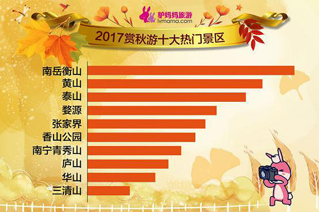 进入9月,华夏大地醉美秋色逐渐显现,枫叶、银杏叶等色彩迷人,国内众多景区将迎来“赏秋潮”。驴妈妈数据显示,南岳衡山、黄山、泰山、婺源、张家界、香山公园、南宁青秀山、庐山、华山、三清山成为赏秋游十大热门景区。