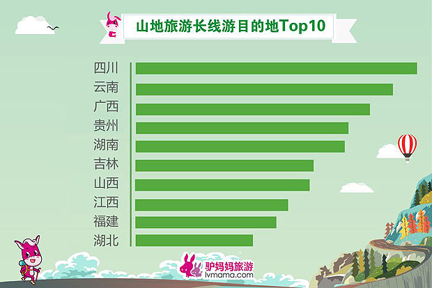 《报告》根据过去一年驴妈妈平台上预订山地旅游产品和景区门票的数据,统计出了最受山地游客欢迎的周边游目的地和长线游目的地。黄山、成都、舟山、湖州、乐山、临安、清远、泰安、承德、金华成为国内十大热门山地周边游目的地。而长线用户则更加偏爱四川、云南、广西、贵州、湖南、吉林、山西、江西、福建、湖北等拥有丰富山地旅游资源的省份。