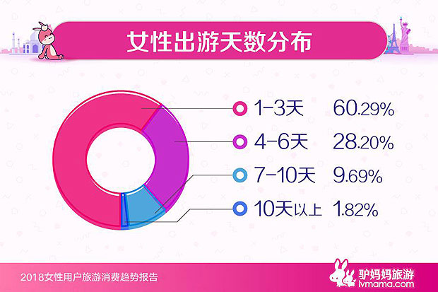 在出游天数上,女性用户对短途游有着更为旺盛的需求。驴妈妈旅游网数据显示,过去一年的女性用户相关订单中,出游天数为“1-3天”的订单高达60.3%,表明相较于长途旅行,女性更愿意在日常工作和生活中给自己“放个小假”,旅游度假消费已经成为女性日常支出项目之一。
