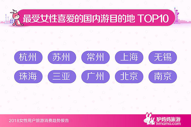 在旅游目的地偏好方面,驴妈妈旅游网数据显示,最受女性喜爱的国内游目的地前十名分别是:杭州、苏州、常州、上海、无锡、珠海、三亚、广州、北京、南京;最受女性喜爱的出境游目的地前十名目的地分别是:泰国、中国香港、越南、菲律宾、日本、马来西亚、澳大利亚、美国、尼泊尔、新西兰。