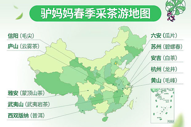 “我国旅游业正从高速旅游增长阶段向优质旅游发展阶段转变,采茶游正是值得推广的优质旅游产品之一,采茶既是乐趣,也是一种文化,带上家人一起到茶园采下新春第一捧新绿,是别样的生活情调,”驴妈妈旅游网公关部总经理李秋妍说,“例如浙江安吉已经开启了白茶季,游客可前往安吉白茶第一村——黄杜村,从采茶开始,全程参与制茶的全过程,制作一杯完全属于自己的安吉白茶,更可入住茶园里的帐篷客酒店,真正做到远离尘嚣、拥抱自然。”