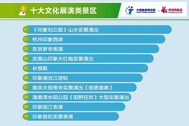 以印象系列为代表的文化展演令游客为之赞叹。《印象刘三姐》山水实景演出、杭州印象西湖、东京梦华表演、武夷山印象大红袍实景演出、长恨歌、印象澜沧江游轮、南京大报恩寺实景演出《报恩盛典》、海棠湾水稻公园《田野狂欢》大型实景演出、印象丽江表演、印象普陀实景表演是深受游客喜爱的十大文化展演。
