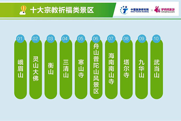 弘扬清明传统、踏青祭扫两不误,祈福类景区受欢迎。清明时节,也有不少人喜爱登高祈福,在饱览自然风光、愉悦身心的同时,缅怀先人,为亲人祈福。峨眉山、灵山大佛、衡山、三清山、寒山寺、舟山普陀山风景区、海南南山寺、塔尔寺、九华山、武当山在祈福类景区中排名前十。峨眉山“普贤文化节”、南山寺的清明思亲法会、九华山千人祈福大典等清明活动,弘扬了中华民族的传统文化,深受游客喜爱。