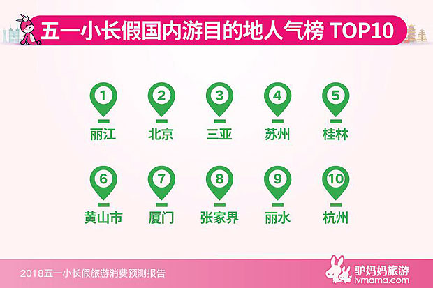 驴妈妈旅游网数据显示,截至目前五一小长假预订最旺的十大国内游目的地分别是:丽江、北京、三亚、苏州、桂林、黄山市、厦门、张家界、丽水、杭州。预订增速最快的十大目的地则分别是:上海、苏州、黄山市、长沙、丽水、珠海、重庆、上饶、乐山、大连。
