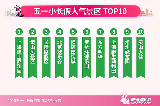 伴随着五一小长假进入倒计时,周边游市场即将迎来报名高峰。从驴妈妈旅游网当前的预订情况来看,上海迪士尼乐园、黄山风景区、长隆度假区、北京欢乐谷、横店影视城、罗蒙环球乐园、东方明珠、上海野生动物园、常州恐龙园、灵山大佛排在全国热门预订人气榜单前十位。