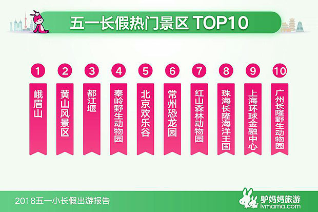 全域旅游时代,拥有优质旅游资源的景区依然是最热门的节假日出游目的地。从驴妈妈数据来看,峨眉山、黄山风景区、都江堰、秦岭野生动物园、北京欢乐谷、常州恐龙园、红山森林动物园、珠海长隆海洋王国、上海环球金融中心和广州长隆野生动物世界成为五一小长假十大热门景区。
