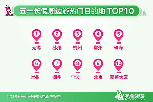 在国内游方面,2-3小时车程的短途周边游最为火爆,上海、南京、北京、广州和杭州的市民最喜爱周边游。无锡、苏州、杭州、常州、珠海、上海、潮州、宁波、北京和嘉善大云以优质的旅游资源,成为今年五一的周边游十大人气王。以首次进入TOP10榜单的嘉善大云为例,今年五一期间,大云举办了丰富多彩的活动,如浙江省第二届杜鹃文化节,50余万盆杜鹃盆花集中亮相;歌斐颂巧克力小镇糖果盛大party、大运樱桃采摘季等活动,都非常受亲子人群的青睐。