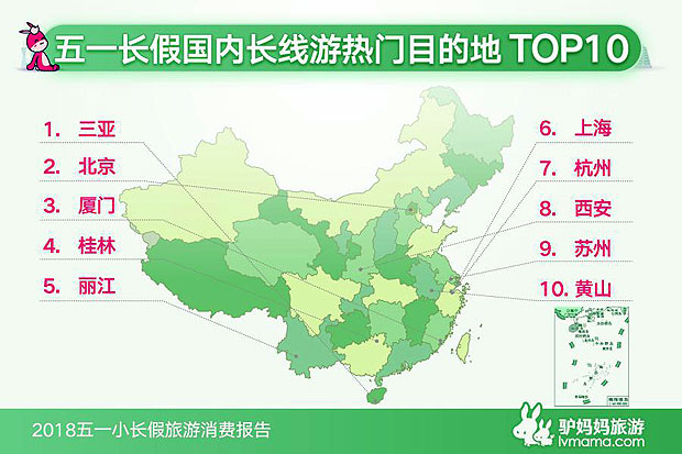 在国内长线游方面,三亚、北京、厦门、桂林、丽江、上海、杭州、西安、苏州和黄山共同组成了最受游客喜爱的国内长线游目的地TOP10。不久前,海南刚刚实施了59国人员入境旅游免签政策,海内外游客的叠加使得海南尤其是三亚,再次摘得五一国内长线游目的地排名的桂冠。