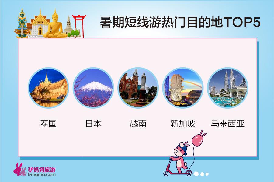 出境短线游方面,泰国、日本、越南、新加坡、马来西亚等地最受中国游客喜爱,游海岛避暑、体验异域风情、品尝当地特色美食等都是吸引中国游客的重要因素。如驴妈妈推出的“泰国普吉岛7日5晚游”,享2晚私人海滩酒店、3晚海边酒店,玩转PP岛、珊瑚岛,看人妖秀、骑大象,体验泰式按摩,线路预订火爆;“日本东京、富士山、奈良、进度、大阪6日5晚游”,25人精品团,尽享日本地道美食盛宴,赏唐风、悟禅意,颇受游客追捧。