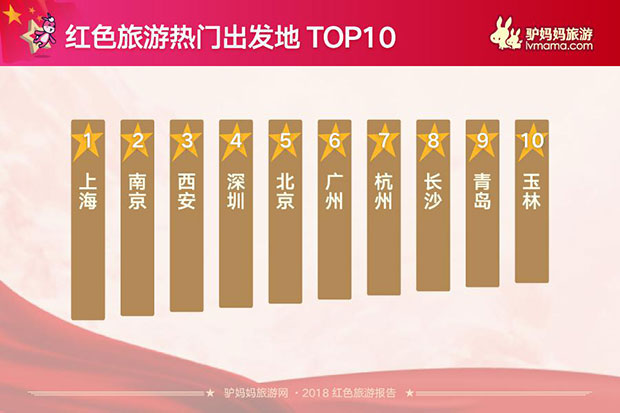 通过《报告》得知,上海、南京、西安、深圳、北京、广州、杭州、长沙、青岛、玉林位列驴妈妈平台赴国内红色旅游十大出发地城市。上海、南京、西安三地本身就是红色文化重镇,对于红色文化的保护和教育传承很有经验;同时,三地经济水平位居全国前列,也是中国教育资源最集中的三个城市;因此,三地民众自小对于红色历史文化的探寻就有非常深厚的兴趣。