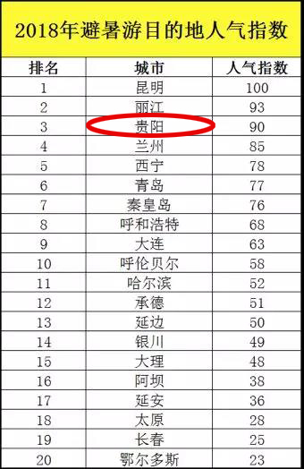 7月25日,中国旅游研究院&携程旅游大数据联合实验室发布《2018年中国避暑旅游大数据报告》。在“2018年最受欢迎的避暑目的地榜单”中,贵阳市荣获第三名,人均避暑花费为2687元,属性价比非常高的避暑旅游城市。在“涉水避暑人气排行榜”中,贵州省的“黄果树+荔波+西江千户苗寨六日五晚跟团游”线路榜上有名。