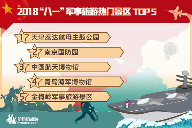 驴妈妈旅游网数据还显示,北京、天津、南京、青岛、南昌位居军事旅游五大热门目的地。此外,武汉、赣州、保定、威海、沈阳游客人次增幅也相对较快。哪些景点更受游客青睐呢?驴妈妈数据显示,天津泰达航母主题公园、南京国防园、中国航天博物馆、青岛海军博物馆、金梅岭军事旅游景区等景区人气火爆。