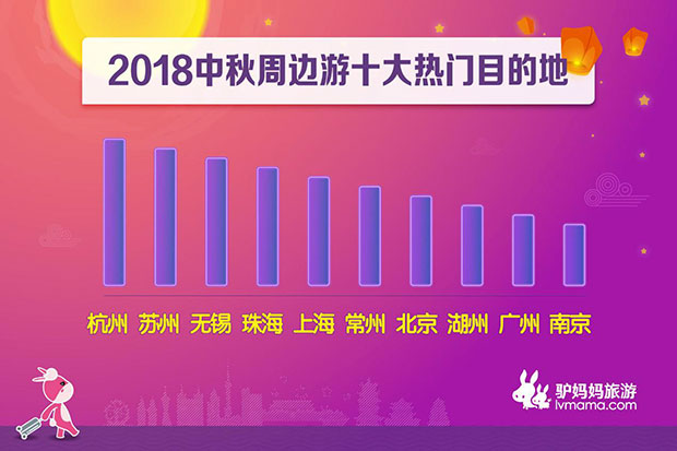“海上生明月,天涯共此时”。今年中秋,“团圆在路上”成为人们欢度中秋的热门选择。9月24日,驴妈妈旅游网发布的《2018年中秋出游报告》显示,假期首日、次日迎来出游高峰,出游人次占比达8成,其中周边游人气最旺,占比达6成。上海、北京、南京、广州、杭州、宁波、成都、深圳、苏州、武汉等十城市居民出游热情最高。