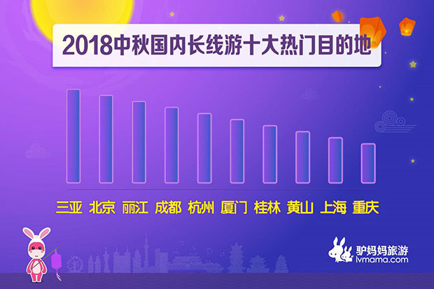 赏月游依然火爆,海边、山顶、草地帐篷等各种赏月主题游都颇受游客喜爱。同时,跟着特色酒店去度假也颇受欢迎。从驴妈妈中秋热销产品来看,除高星酒店外,亲子主题酒店、文化主题酒店等综合热度上升最快,如迪士尼玩具总动员酒店、长隆企鹅酒店、无锡拈花湾客栈、宋城千古情主题酒店、安吉银润锦江城堡酒店等。