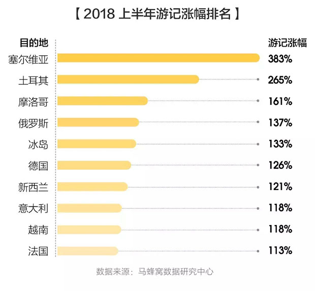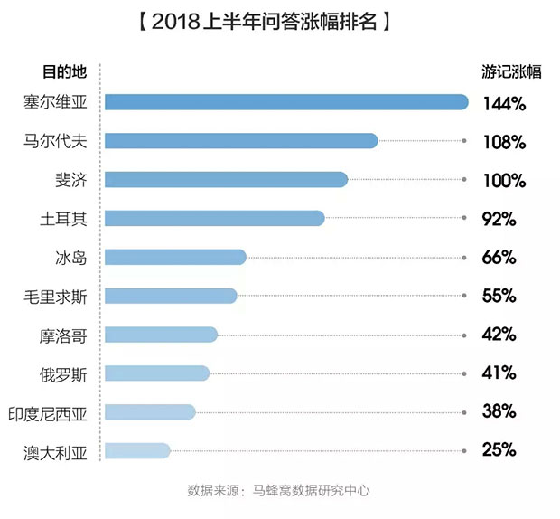 数据显示,2018年上半年,塞尔维亚的游记和问答内容涨幅分别为383%和144%,均位列全球第一。土耳其的游记涨幅达到265%,排名第二,问答涨幅也达到92%。摩洛哥、俄罗斯和冰岛的游记涨幅均在130%以上。海岛类目的地的相关问答涨幅同样较高,马尔代夫、斐济、毛里求斯的问答涨幅分别为108%,100%和55%。