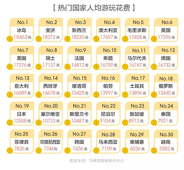 主打休闲度假的海岛花费也较高,人均游玩花费都在万元以上,其中,斐济和毛里求斯分别为18372元和17458元,马尔代夫和帕劳的人均花费也分别达到16747元和13897元。