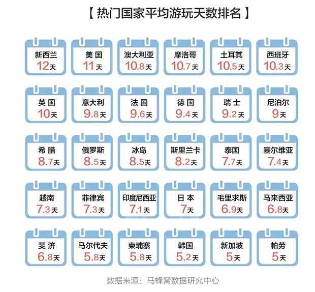 在游玩天数上,大洋洲、北美洲和欧洲国家以长线游为主,数据显示,自由行游客在新西兰的平均游玩时间最长,达12天。其次是美国、澳大利亚、摩洛哥、土耳其、西班牙和英国,均在10天及以上。