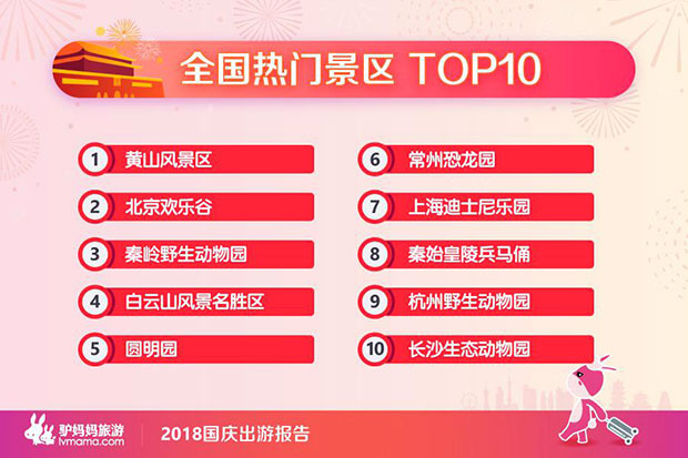 驴妈妈旅游网数据显示,华东、华北、华南等区域的旅游景区最热门。黄山风景区、北京欢乐谷、秦岭野生动物园、白云山风景名胜区、圆明园、常州恐龙园、上海迪士尼乐园、秦始皇陵兵马俑、杭州野生动物园、长沙生态动物园成为全国游玩人次最高的十大景区。