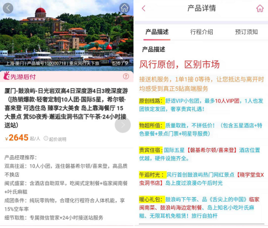 据了解,近期驴妈妈在全国率先推行了“先游后付”新消费模式,游客可以享受先出游,归来后满意再付款。以平台人气较高的厦门鼓浪屿避寒跟团游产品为例,旅途中的接机、住宿、餐饮、线路等方面进行了规定,如果出行中发生行业违规,或未达到约定服务标准,驴妈妈根据相应的赔付条款,向游客进行赔付。