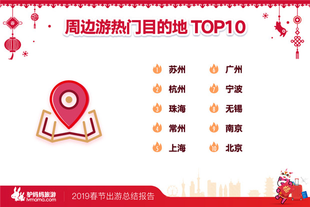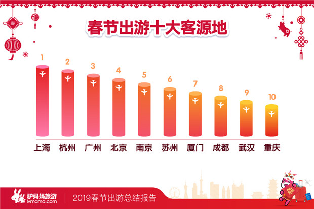 2月10日(正月初六),驴妈妈旅游网发布的《猪年春节出游总结报告》(以下简称《报告》),今年春节出游高峰从除夕到初三,但提前“开溜”和抓住“尾巴”错峰游的人次,同比18年占比提升了13%;从客源地来看,上海、杭州、广州、北京、南京、苏州、厦门、成都、武汉、重庆等十城市居民,更喜欢在旅途中过大年。