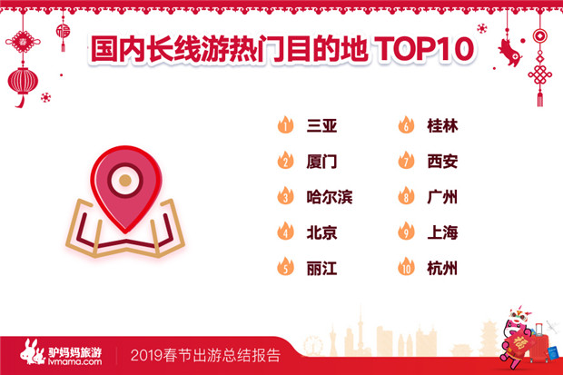 其中,三亚、厦门、哈尔滨、北京、丽江、桂林、西安、广州、上海、杭州位居国内长线游十大目的地。热销产品如驴妈妈平台“哈尔滨、雪乡、雾凇、万科滑雪、沈阳双飞5日4晚跟团游” 唯美雾淞画廊、松花湖冬捕、参观沈阳故宫、张氏帅府;如选购广州长隆等自由行套餐的游客,不少人也同时预订了陈家祠、黄埔军校、沙湾古镇等相关产品。