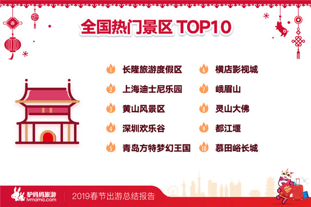 《报告》显示,从全国范围来看,长隆旅游度假区、上海迪士尼乐园、黄山风景区、深圳欢乐谷、青岛方特梦幻王国、横店影视城、峨眉山、灵山大佛、都江堰、慕田峪长城等十大景区,在春节出游中热度最高。