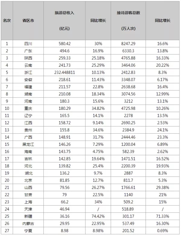 2019年春节假期已结束,在已经公布春节旅游收入的27个省份中,四川以580.42亿元列旅游总收入排行榜第一名,同样也是接待游客总数最多的省份。根据排行榜中的数据显示,19省份旅游总收入均超过百亿,其中8省份旅游总收入超过200亿元,分别为四川、广东、陕西、云南、浙江、安徽、福建、湖南。