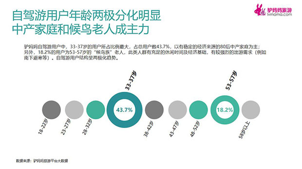在用户年龄分布上,33-37岁的用户所占比例最大,占总用户数43.7%,以有稳定的经济来源的80后中产家庭为主;另外,18.2%的用户为53-57岁的“候鸟族”老人,此类人群有充足的休闲时间及经济基础,有较强烈的出游需求(例如南下避寒等)。自驾游用户结构呈两极化趋势。