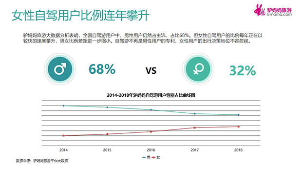 《报告》显示,全国自驾游用户中,男性用户仍然占主流,占比68%。但女性自驾用户的比例每年正在以较快的速度攀升,男女比例差距进一步缩小。自驾游不再是男性用户的专利,女性用户的出行决策地位不容忽视。