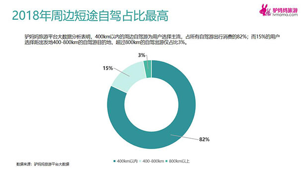 驴妈妈旅游平台大数据分析表明,400km以内的周边自驾游为用户选择主流,占所有自驾游出行消费的82%;而15%的用户选择距出发地400-800km的自驾游目的地,超过800km的自驾出游仅占比3%。