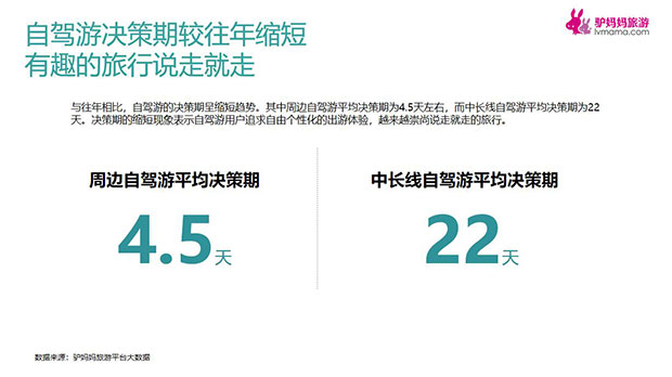 与往年相比,自驾游的决策期呈缩短趋势。其中周边自驾游平均决策期为4.5天左右,而中长线自驾游平均决策期为22天。决策期的缩短现象表示自驾游用户追求自由个性化的出游体验,越来越崇尚说走就走的旅行。