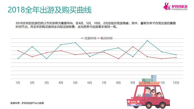 2018全年的出游仍然以节庆放假为重要导向,在4月、5月、10月、2月出现自驾游高峰;其中,暑期为亲子自驾出游的重要时间节点。而全年的购买曲线走向较出游前置,走向趋势与出游基本保持一致。