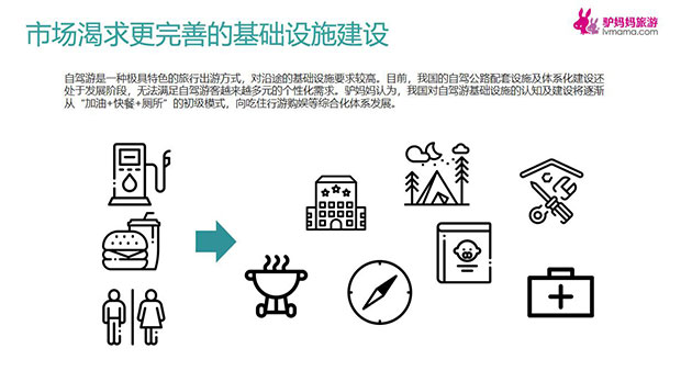 1. 市场渴求更完善的基础设施建设。自驾游是一种极具特色的旅行出游方式,对沿途的基础设施要求较高。目前,我国的自驾公路配套设施及体系化建设还处于发展阶段,无法满足自驾游客越来越多元的个性化需求。驴妈妈认为,我国对自驾游基础设施的认知及建设将逐渐从“加油+快餐+厕所”的初级模式,向吃住行游购娱等综合化体系发展。