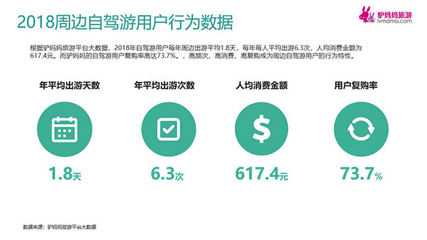 2018年自驾游用户周边游玩时间平均为1.8天/次,每年每人平均出游6.3次,人均消费金额为617.4元。而驴妈妈的自驾游用户复购率高达73.7%,高频次、高消费、高复购成为周边自驾游用户的行为特性。