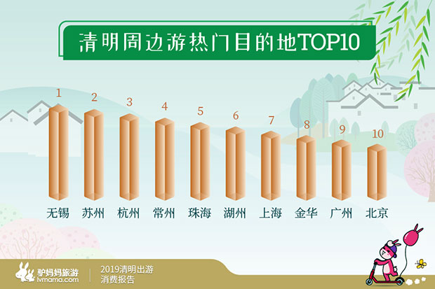 《报告》显示,清明十大热门周边游目的地分别是无锡、苏州、杭州、常州、珠海、湖州、上海、金华、广州和北京。