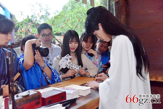在活动现场看到,这次人气最旺的当属“忘忧酒馆”的掌柜小哥哥,游客可拿一把空白折扇,把埋藏在心底的故事汇成一句话,让掌柜小哥哥将这句话用书法题字在扇面上。这位写书法的小哥哥人称“故里”,他表示,从小在爷爷耳濡目染下,练就了一手好书法。这一次,他的颜值和才华吸引了众多游客,来体验的人络绎不绝,争前恐后排队要他写字。