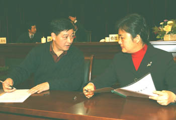 贵州省旅游局局长杨胜明(中)、副局长傅迎春在全省旅游工作会议上为获得2003年度全省旅游行业先进集体和先进个人颁奖