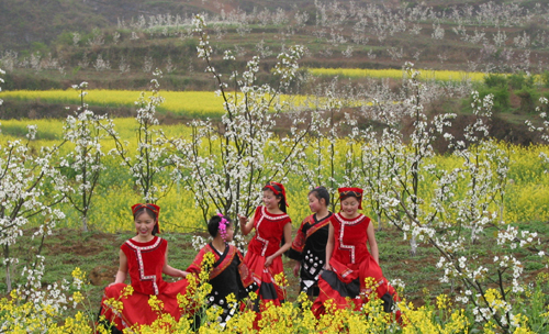 在油菜花的衬托下,雪白的梨花与身穿少数民族服装的少女相映成趣