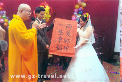 昨天下午、贵阳黔灵寺主持释崇慈法师、在禅悦酥脱,为一双举行结婚典礼的新人作结婚证人,并向他俩致以美好的祝福,新郎新娘家用素席招待了参加婚典的宾客。