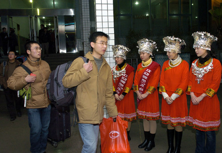 1月25日,几位身着苗族服饰的列车员在贵阳火车站迎接旅客进站。