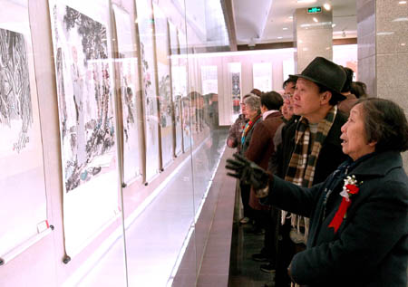 2月4日,几位老人在欣赏贵阳美术馆和贵阳市群众艺术馆于上世纪80年代初收藏的画作。