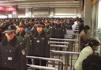 从大年初三开始,贵阳火车站客流迅速上升,2月14日达到春运以来的最高峰,当日发送旅客近2.5万人,据铁路部门估计,此后的一周内该站客流将一直居高不下。为了确保春运的顺利进行,保障广大旅客安全有序出行,目前,贵阳铁路警方1200余名民警已经全部动员,分别活跃在贵州省的五条铁路大干线上,仅贵阳站就有近300名民警昼夜值勤。据了解,贵铁警方在过去的20天春运工作中,抓获票贩子120余人,收缴热点方向车票200余张,票值3万多元,破获各类刑事案件26起,抓获犯罪嫌疑人31名,为旅客挽回经济损失近10万元。